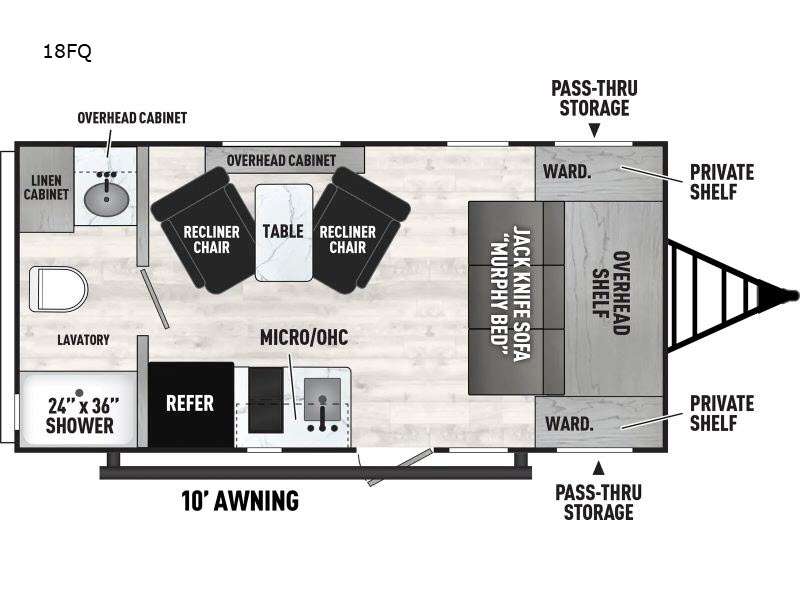 Take this versatile couple's travel trailer to your favorite destinations! It features a front jackknife sofa with Murphy Bed for you to have ample seating during the day and at night a comfy bed. There are also two wardrobes with a private shelf on each end and an overhead shelf above for your things. There is additional seating with two recliner chairs including a table between opposite the kitchen area. This space also features overhead storage. The full rear bath offers a 24" x 36" shower, sink with medicine cabinet and linen storage as well. You can easily cook simple camp meals using the two-burner cooktop or the microwave. On the exterior, a front pass-through storage compartment is available for all of your outdoor gear!