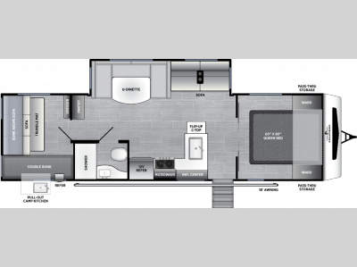 As you step into this trailer, you'll find the main bedroom at the front, featuring a spacious 60" x 80" queen bed with a wardrobe on each side for your clothes and essentials. At the center, the living area offers a large slide-out that holds a roomy U-shaped dinette perfect for meals or game nights beside it a comfortable sofa for extra seating. Opposite the slide, the L-shaped kitchen comes fully equipped with a 10-cu. ft. refrigerator, Magic Chef microwave and gas cooktop, plus a flip-up countertop for added prep space. Toward the rear, a full bathroom includes a large shower and generous counter space, and at the very back, the bunkhouse provides sleeping room for up to five, features a double bunk, bunk above sofa and trundle mat, making it easy to bring the whole crew along for the adventure.