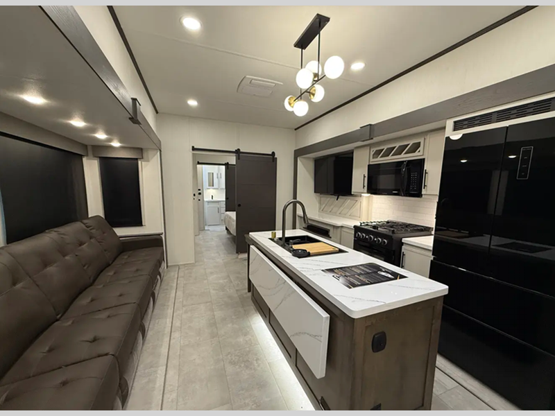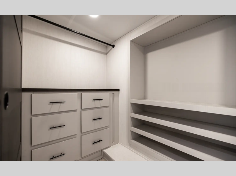 Each luxurious model features real wood cabinet doors, heat rated solid surface countertops throughout, blackout roller shades, and a king-size bed to provide the highest level of owner satisfaction. These fifth wheels also include an electric awning with LED lights outside, as well one-touch auto leveling, doggy d-ring, and a labeled universal docking center to have you set up to camp in no-time!