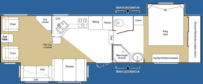 Double Slide, Rear Living Area w/2 Lounge Chairs & End Table, Sofa, Booth Dinette, Ent. Center, Dbl. Kitchen Sink, 3 Burner Range, Refrig., Pantry, Flip-Top Counter, Stool Room, Linen Cabinet, Angle Shower, Lav., Pass-Thru Storage, Vanity/Clothes Hamper, King Bed Slide w/Nightstands & More.